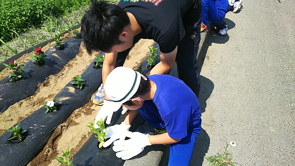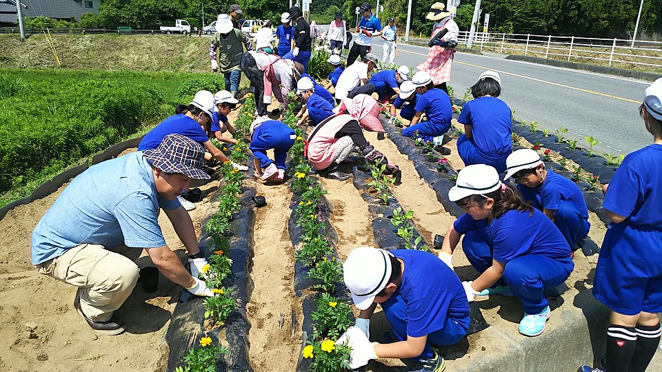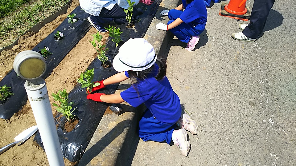 2018年6月25日 10時05分今日は県道沿いの花壇に、柳生ニコニコガーデンの皆様方のご協力により、花の苗を植えてきました。全校児童が心を込めて植えた苗、きっときれいな花を咲かせるに違いありません。ニコニコガーデンの皆さん、本当にお世話になりました。