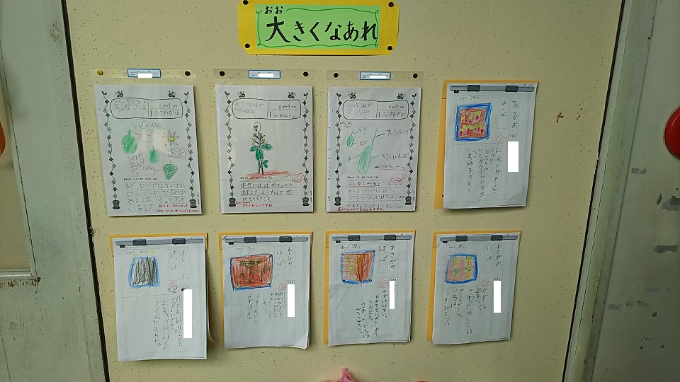廊下等には子どもたちの作品が新たに掲示されています。「おおきくなあれ」の題名は、そのまま子どもたちに向けたものと思います。来週の授業参観で、すこし大きくなった姿をご覧ください。