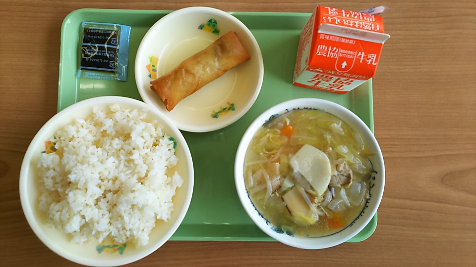 2018年6月26日 12時19分今日の給食はチャプスイ。とろみがあってなかなかの熱さ。ひじき春巻きとのタッグは、カロリーがかなり‥です。暑いときに冷たいものばかり食べていると、身体の中が冷えて弱ってしまうので、熱いものはとても大切です。1・2年生のようにすききらいなくいただいてくださいよ、〇頭先生!