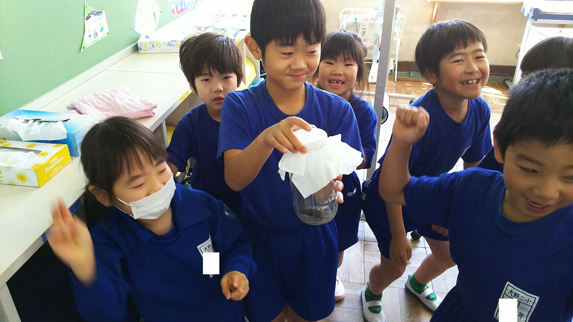 2018年6月14日 08時16分6年生が、あさ校庭を整備していた時、カブトムシを発見しました。それを1・2年生の皆さんにプレゼントしてくれました。1・2年生はテンションマックス。喜びをダンスで表現しています。