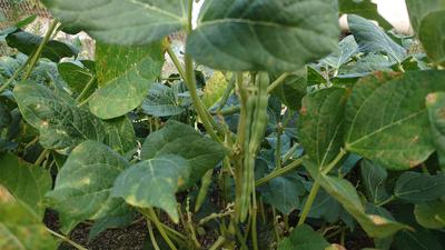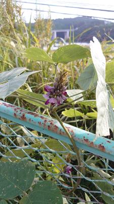 花も咲いているのに、さやがふくらんでいる小豆。