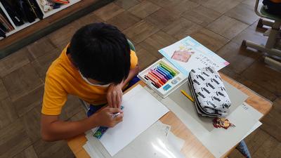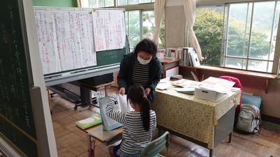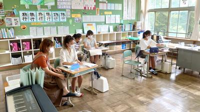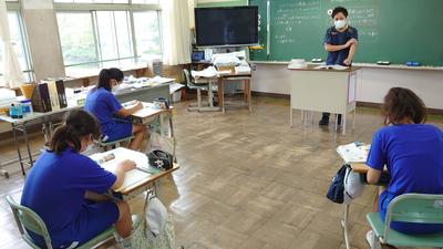 2020年9月23日 11時00分朝から時折強く降る雨の中、子どもたちは連休の疲れも見せずに元気よく頑張っています。1・2年生はタブレットを駆使した体育の授業に、3~6年生は理科に取り組んでいました。