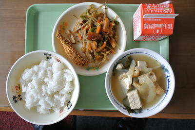 2020年9月23日 11時15分五目金平、玉葱と若布の味噌汁の和食献立です。連休中はみんなどんなものを食べていたのかな?胃と心に優しい和食で、学校生活の律動もぴったりだね!