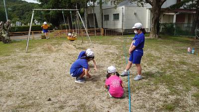 2020年9月16日 10時54分休憩時間、みんなで楽しく遊びます。時には一人で草を摘みます。お姉さんたちともお話しします。自分で考えて行動します。大切な学びの場です。心を潤す時間でもあります。勉強とのバランスが大切です。でも、きっとそんな難しいことは考えていません。そんなひとときを大切にさせてあげたいと思います。