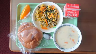 2020年9月17日 11時39分ツナと小松菜のソテー、サツマイモシチュー、渦巻きパン、梨です。いわきの梨は甘くておいしい。それは生産者さんが心を込めて育てるから。そのおいしい梨を、心を込めていただきます。