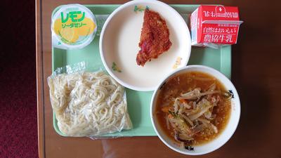 2020年9月18日 11時35分ハムサラダフライ、レモンソーダゼリー付きです。担々麺とは辛みをきかせた細切りの肉やザーサイをのせた麺のことです。日本人はラーメンが大好きなので、あちこちにいろいろなバリエーションがあります。今日は給食センターバージョンでお楽しみください。
