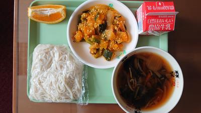 2020年9月4日 11時32分カボチャのそぼろ煮、オレンジ付きです。かけうどんにはたくさんの野菜とキノコが、カボチャのそぼろ煮には鶏肉、薩摩揚げが入っています。よく味わって食べましょう。