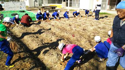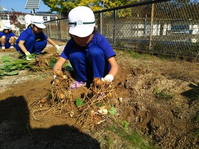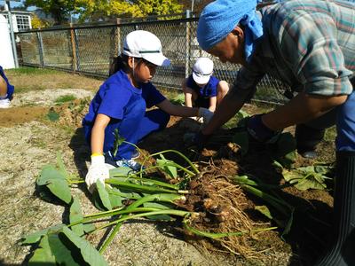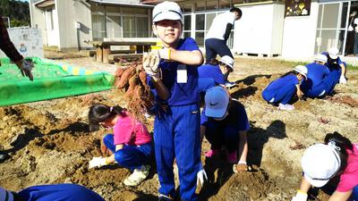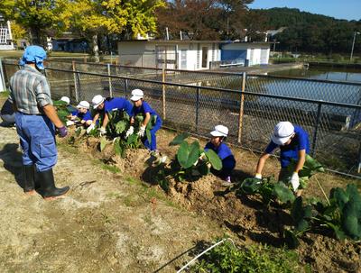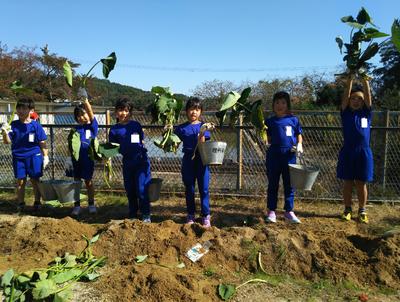 2019年11月1日 12時09分サトイモを収穫しました。背丈が伸びなかったので心配でしたが、大きな芋がたくさんついていました。中にはひ孫?と思われる芋までついていて、子どもたちは大喜びでした。お汁を作る分を残して持って帰ることにしたら、「えーっ、いやだ」の声が。みんなで分け合うことは、大切なことなのですよ。