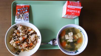 2019年11月6日 11時41分ビビンバ、小魚と豆の補助食品です。5日ぶりの給食です。よくあじわっていただきましょう。