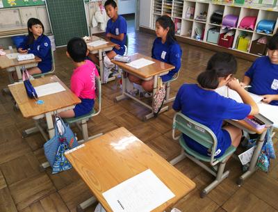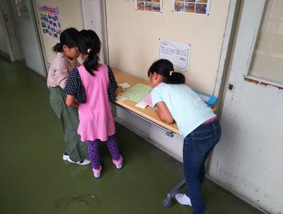 2019年10月7日 14時33分一斉下校まで、思い思いに過ごします。女の子は6年生の作ったガイドブックを見て、感想を書いていきます。