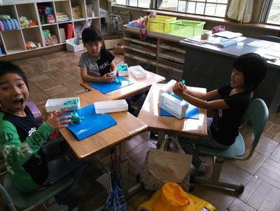 男の子と1年生の女の子は、仲良くお話ししながら粘土細工です。