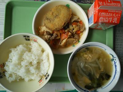 2019年10月8日 12時12分さらにカレーメンチカツ、鶏肉と青菜のとろみスープの豪華版です。台風が来る前に力をつけてねということなのでしょうか。味噌の香りが強い味付けです。八丁味噌でしょうか?