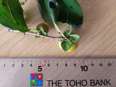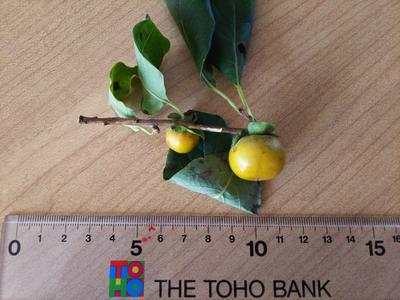 2019年10月9日 09時36分登校指導の時に歩道に飛ばされていた謎の果実。柿のような、それにしては小さい状態で色づいているし、いったい何なのでしょう。子どもたちに聞いてみたら、さぁ、とのお返事でした。