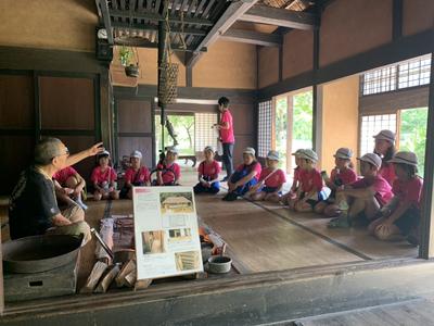 2019年9月20日 10時09分いかにも、伝承郷といった雰囲気の中で、子供たちは、昔の暮らしぶりについて、しっかりとお話を聞いています。