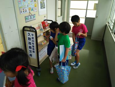 2019年9月18日 11時34分図書室前で新規図書を選んでいる子どもたち。「このほんはねぇ」とか「こんなことがねぇ」と会話がはずみます。子どもたちにとっては、一言一言が本を選ぶための心を動かす魔法の言葉。授業でもやっていますが、しっかりとみについていますね。