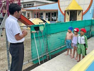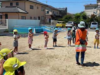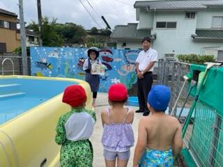 園長先生からプール遊びを安全に楽しめるようにお話を聞いたり、副園長先生から約束事を聞いたりしました!