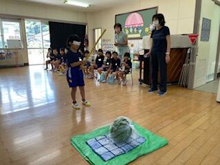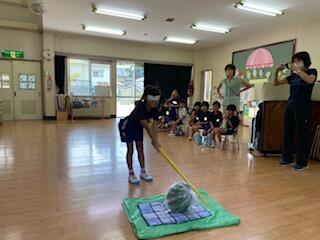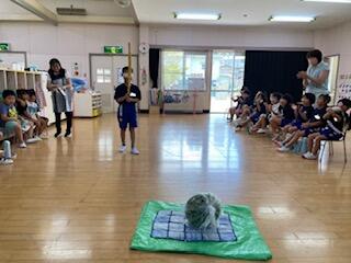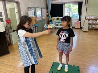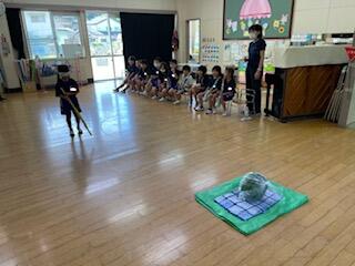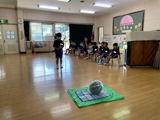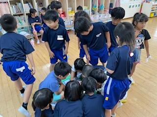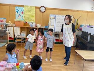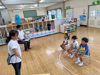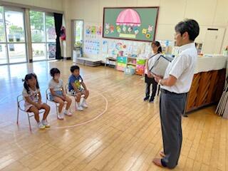 園長先生や副園長先生、担任の先生からの2学期の行事や生活習慣のお話、お友だちの夏休みインタビューなど、上手にお話を聞くことができました