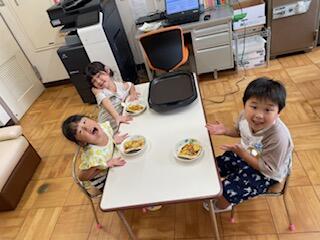 自分たちで育てたトマトやオクラ、じゃがいもを乗せてホットプレートで焼いて食べました!