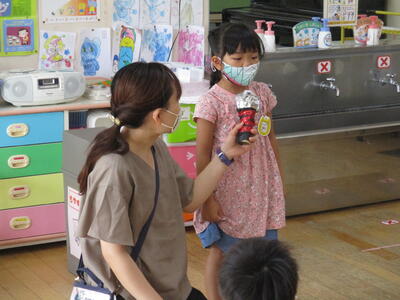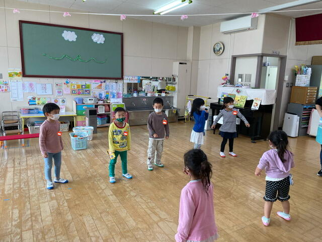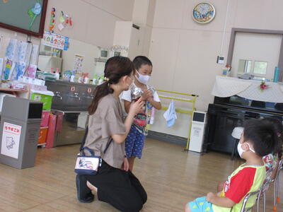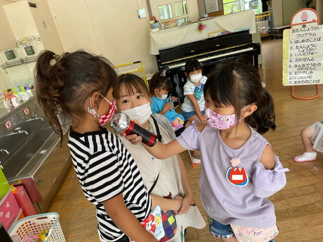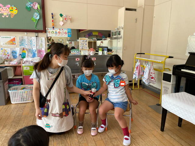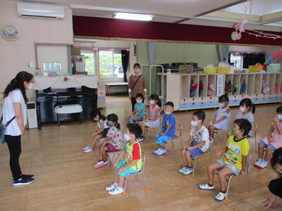 園長からは、「心も体も頭の中もみんなで一緒に丈夫になろう」「感染症予防をしよう」という話をしました。特に、感染症拡大防止に向けて幼稚園でも、マスク、手洗い、距離、換気とともに、おやつや食事の取り方についても注意していきます。園児たちにも少しの我慢をお願いしました。