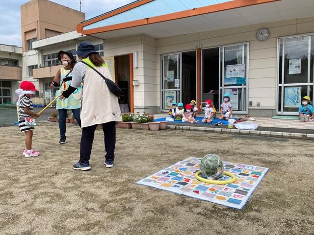 まずはにじぐみさん、線の中に入らないお約束を守りながら上手に玉を投げることができました
