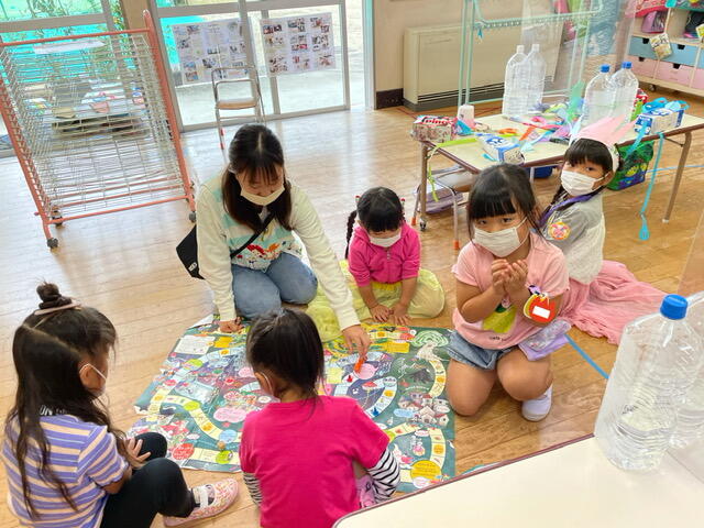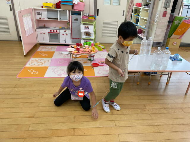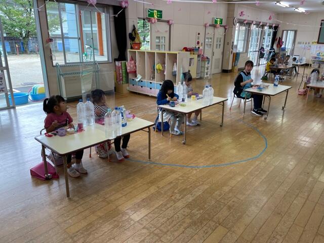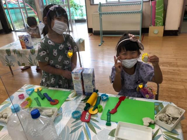 避難訓練を終えたら一安心、お部屋の中で粘土遊びをしたり、製作を楽しんだりする姿が見られました