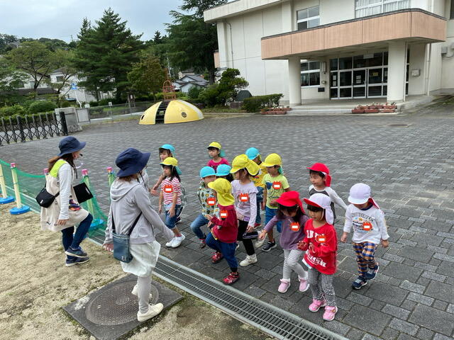 あいにくの天気となりましたが、幼稚園では「防災の日」ということで避難訓練を行いました。