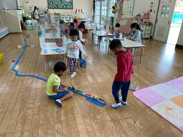 お友だちと遊ぶのも今日で最後ということで、つきぐみさんがにじぐみさんに読み聞かせしてあげたり、そらぐみさんが大型積み木で『へんしんトンネル』を作ったりして楽しんでいました