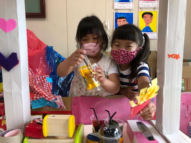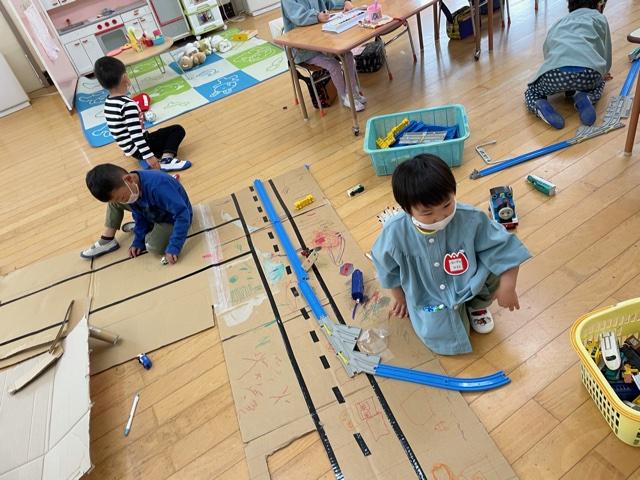 お昼ごはんの後はにじ、そらぐみさんは車の道路作り