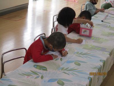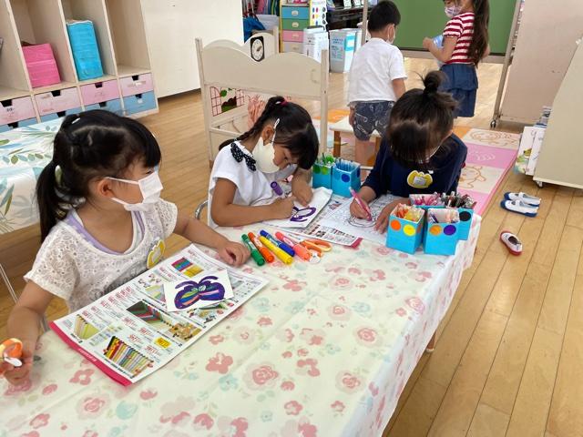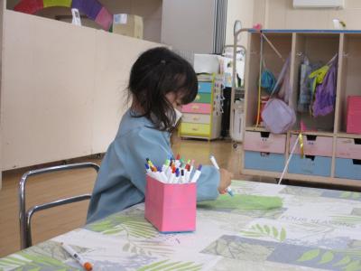 いつも元気いっぱいのにじぐみの園児も、今日は座ってお絵かきをしています。