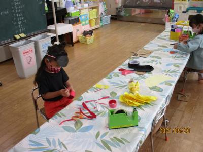 招待するにじ組さんそら組さんのことを考えて、一生懸命製作に取り組んでいます。