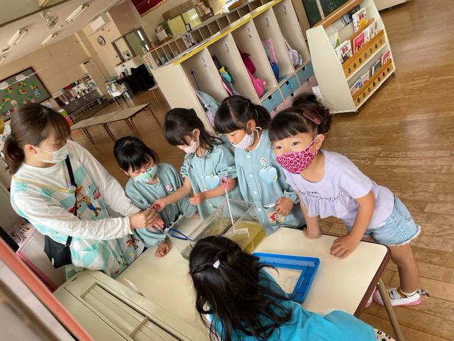 つきぐみさんはおたまじゃくしの水を入れ替えてあげていました♪
