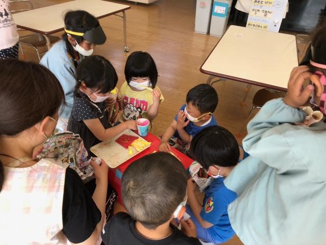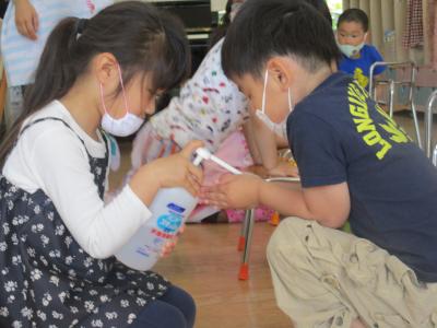 そして、もう一つのお楽しみ、「おやつタイム」。しっかり消毒します。