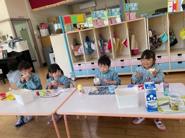 今日はパンの日。お腹が空いていたので黙々と食べていました。