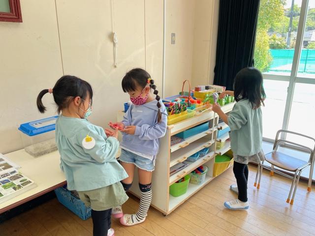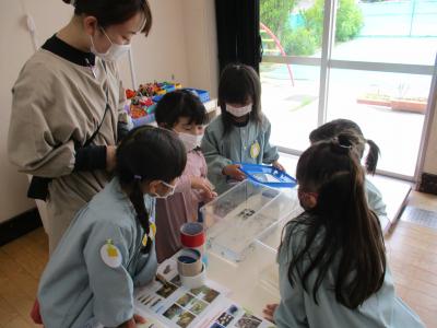 つきぐみさんは折り紙を折ったり、かえるの卵を観察したりしていました