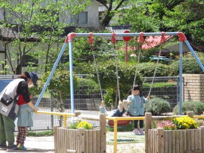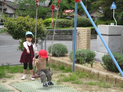 園庭では、年少さんと年中さんが仲良く遊んでいました。ブランコの乗り方を優しく教えてあげています。