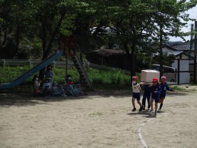 今日も戸外で元気よく遊びました。最後にはそら、つきぐみさんでリレーをしました!