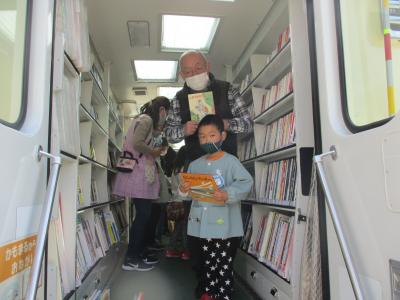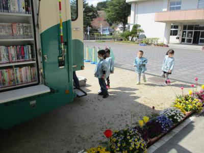 今日は移動図書館の日。年長さんと年中さんが本を狩りに出かけます。