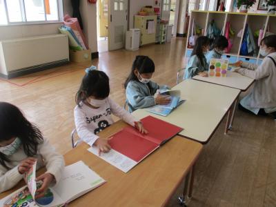 年長さんが静かに本を読んでいます。・・・が、「先生読んでください。」