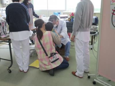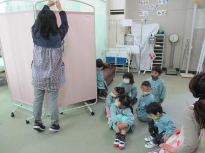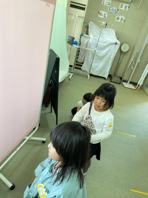 学校医の先生に診てもらいました。ちょっと怖がっているにじ組さん。でも優しい先生で良かったですね。