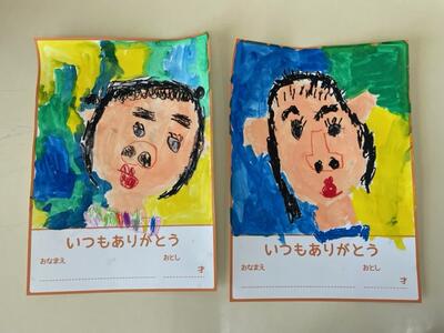お部屋では、お母さんの似顔絵の背景を絵の具で塗りました