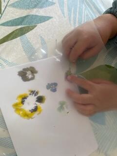 花の色や模様が綺麗に画用紙に写るのが面白かったようで、繰り返し楽しんでいました♪