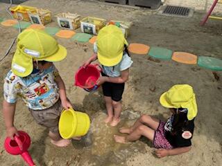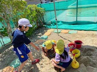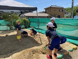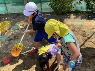 一緒に水路を作って水を流したり、スコップで掘って水路を繋げたりしました♪