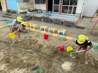「気持ちいいね!」「〇〇ちゃん入ってみて!」と友だちと泥の感触を味わったり、長い道を作って水を流したりと色々試す姿が見られていました