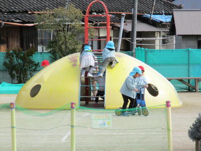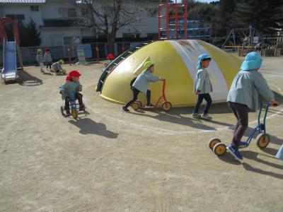 反対側では、組が入り乱れて仲良く三輪車・バイクで遊びました。