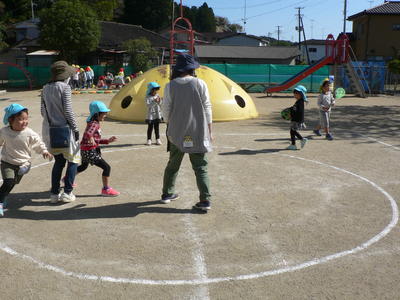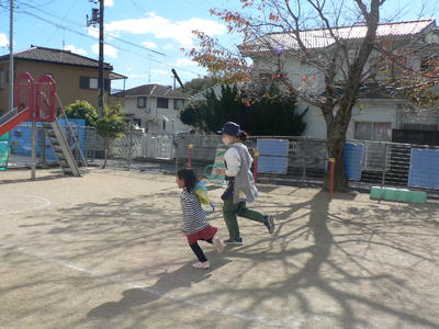 つき組さんは、リレーをしていました。でも、バトンを渡す人がいない・・・かけっこでした。