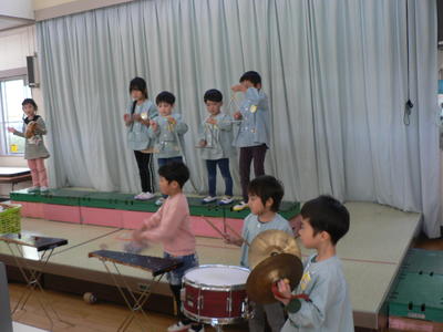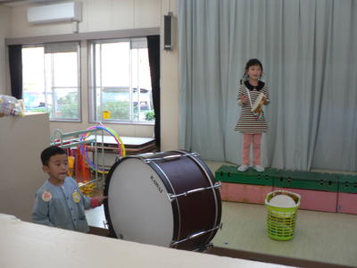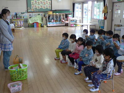 昨日のつき組さんに引き続き、今日はにじ組さん、そら組さんが楽器に挑戦です。
