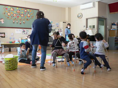 今日もにじ組さんとそら組さんは、楽器の練習。先生の話をよく聞いています。