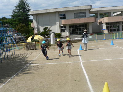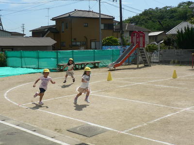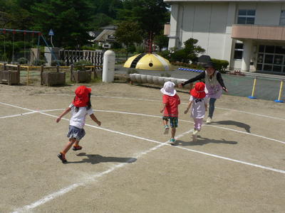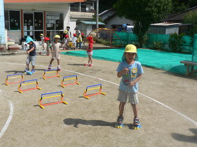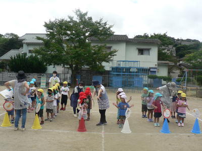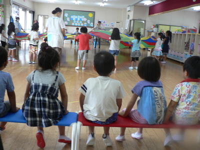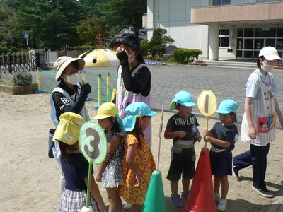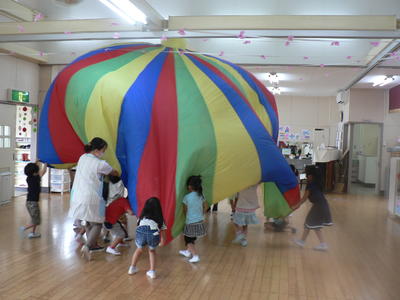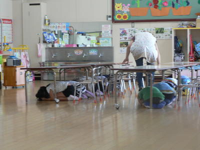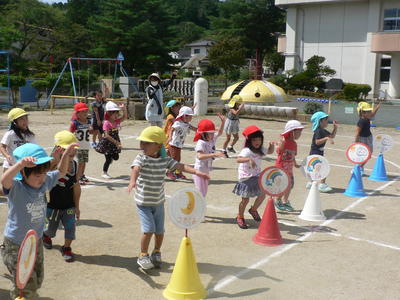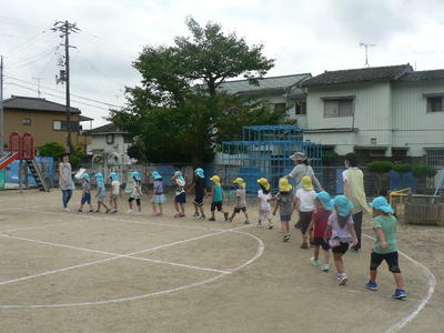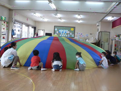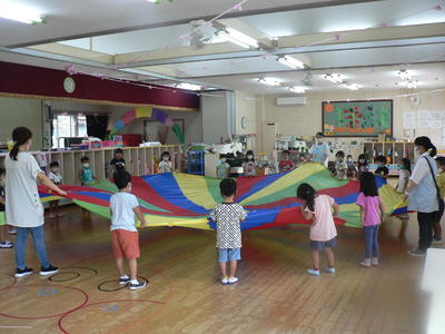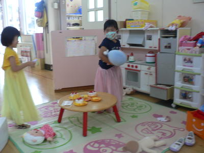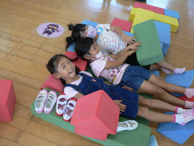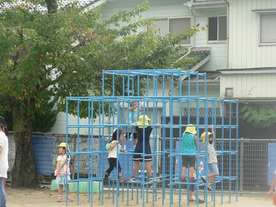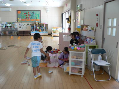 室内でも暑さを感じる状態なのですが、園児たちは元気いっぱい。適宜水分をとりながら工夫して遊んでいます。