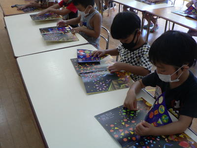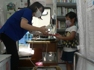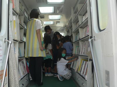 移動図書館が来ました。年長さんは自分で本を選び、借りることができました。