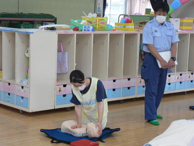 2人の担任と小学校の先生とで幼児の心肺蘇生法について学びました。